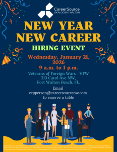 Attention all local businesses! CareerSource Okaloosa Walton is excited to invite you to our New Year – New Career Hiring Event on Wednesday January 21, 2026. This fantastic opportunity will be held at Veterans of Foreign Wars VFW, 213 Carol Ave NW. Fort Walton Beach, FL.